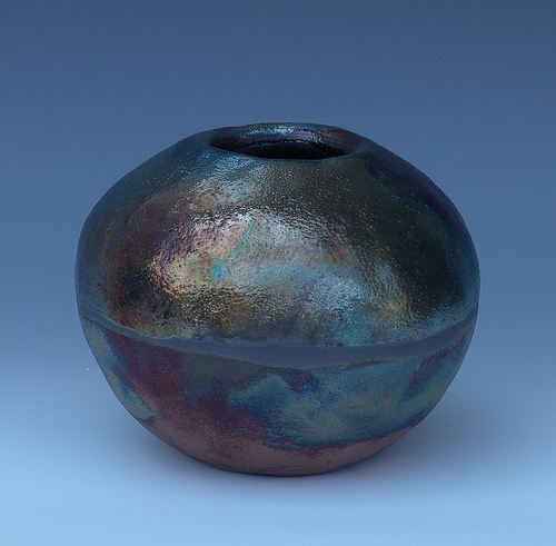 Raku pinch pot. Copper Sand on bottom. Bebe's Blue on top.
